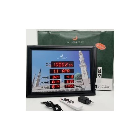 Reloj de Athan mundial que concentra todos los horaros de rezo con su respectiva llamada a la oración, incluye también el corán completo que podrás controlar desde un mando a distancia.